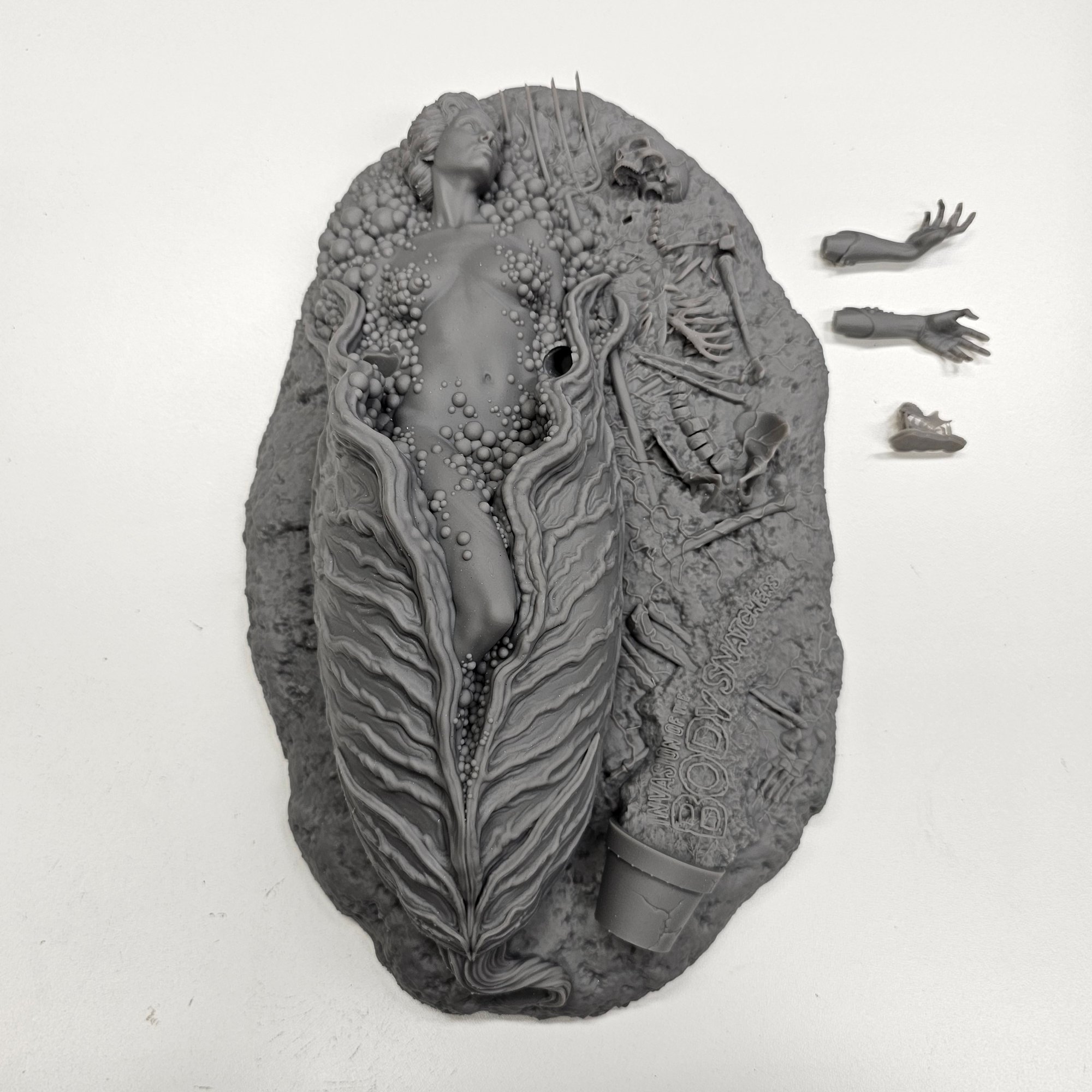 Terrors From The Vault presents Vol. 3 of the Reimagined Classic Creatures.....INVASION OF THE BODY SNATCHERS!!! The model kit's design is inspired from the alien cloned pod people, featured in the 1956 film Invasion of the Body Snatchers. The kit is a "what if" reimagining of the famous greenhouse scene from the film. This terrifying model depicts the unfortunate fate of the female lead if she had unsuspectingly fallen asleep while hiding in the greenhouse containing an alien pod. Her cloned form has almost completed it's transformation while her original body withers away into the dirt.